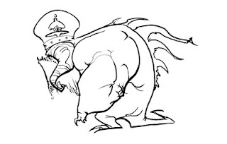 ReplyDeleteGreat line quality in the sketches. I like how the character takes up most of the shot in the cropping, it makes him look even larger, nice job.